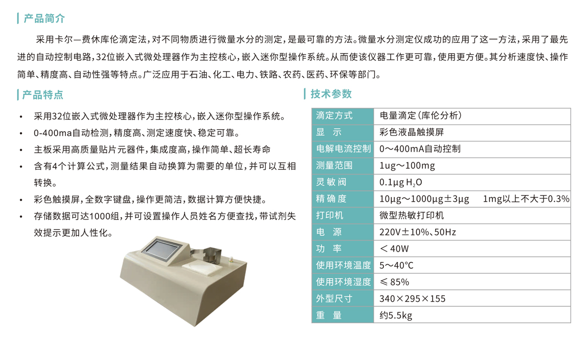 采用卡爾一費休庫倫滴定法,對不同物質進行微量水分的測定,是最可靠的方法。微量水分測定儀成功的應用了這一方法,采用了最先 進的自動控制電路,32位嵌入式微處理器作為主控核心,嵌入迷你型操作系統。從而使該儀器工作更可靠,使用更方便。其分析速度快、操作 簡單、精度高、自動性強等特點。廣泛應用于石油、化工、電力、鐵路、農藥、醫藥、環保等部門。