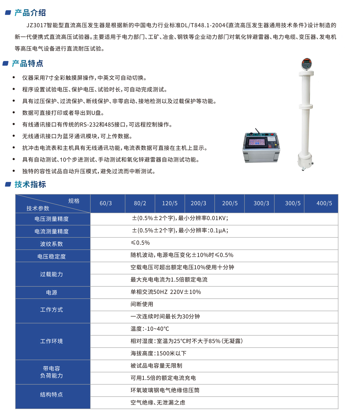 JZ3017智能型直流高壓發生器是根據新的中國電力行業標準DL/T848.1-2004《直流高壓發生器通用技術條件》設計制造的 新一代便攜式直流高壓試驗器。主要適用于電力部門、工礦、冶金、鋼鐵等企業動力部門對氧化鋅避雷器、電力電纜、變壓器、發電機 等高壓電氣設備進行直流耐壓試驗。