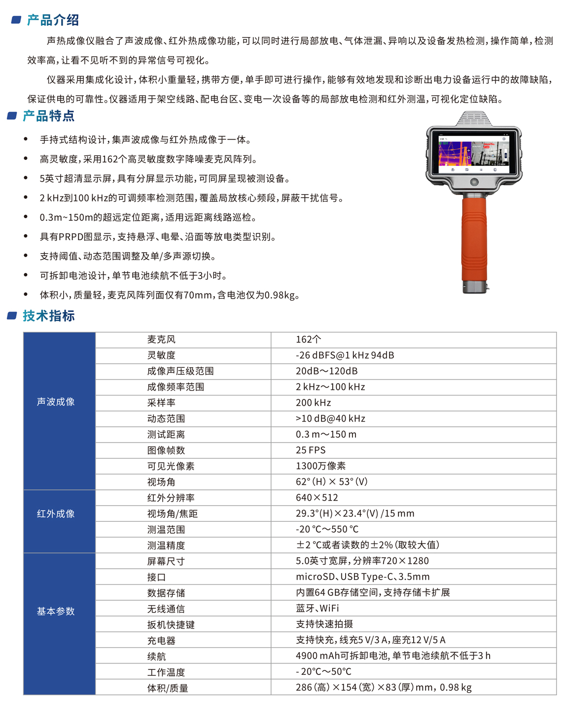 聲熱成像儀融合了聲波成像、紅外熱成像功能,可以同時(shí)進(jìn)行局部放電、氣體泄漏、異響以及設(shè)備發(fā)熱檢測(cè),操作簡(jiǎn)單,檢測(cè)
